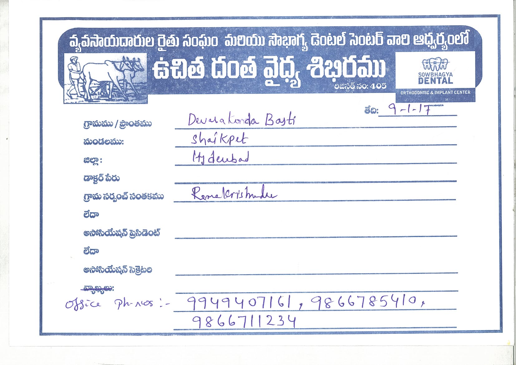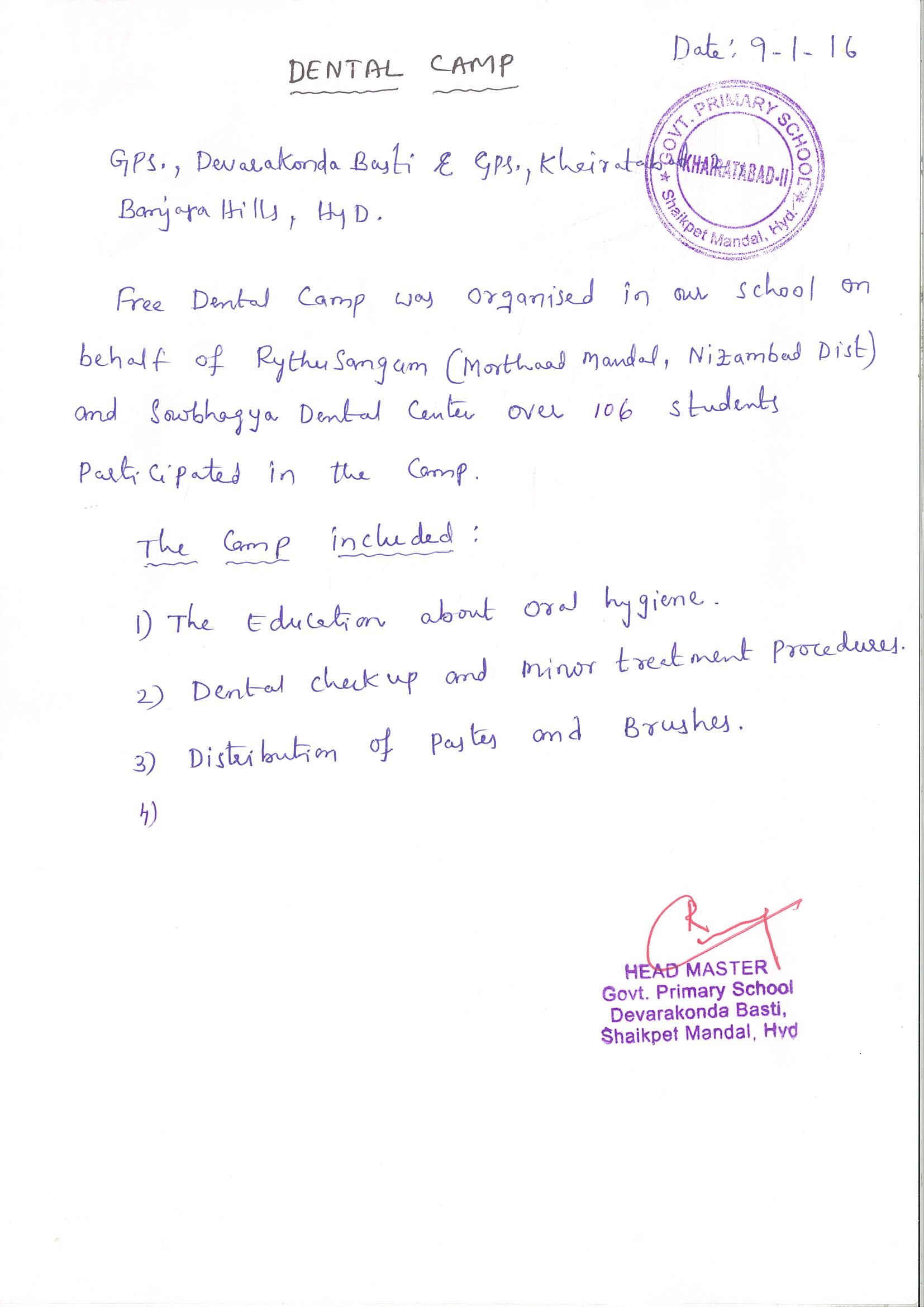 Dental camp was organized in GPS, DEVARKONDA BASTI KHAIRATABAD, BANJARA HILLS, HYDERABAD by Sowbhagya Dental Center on behalf of Farmers Association on 09-01-2016.