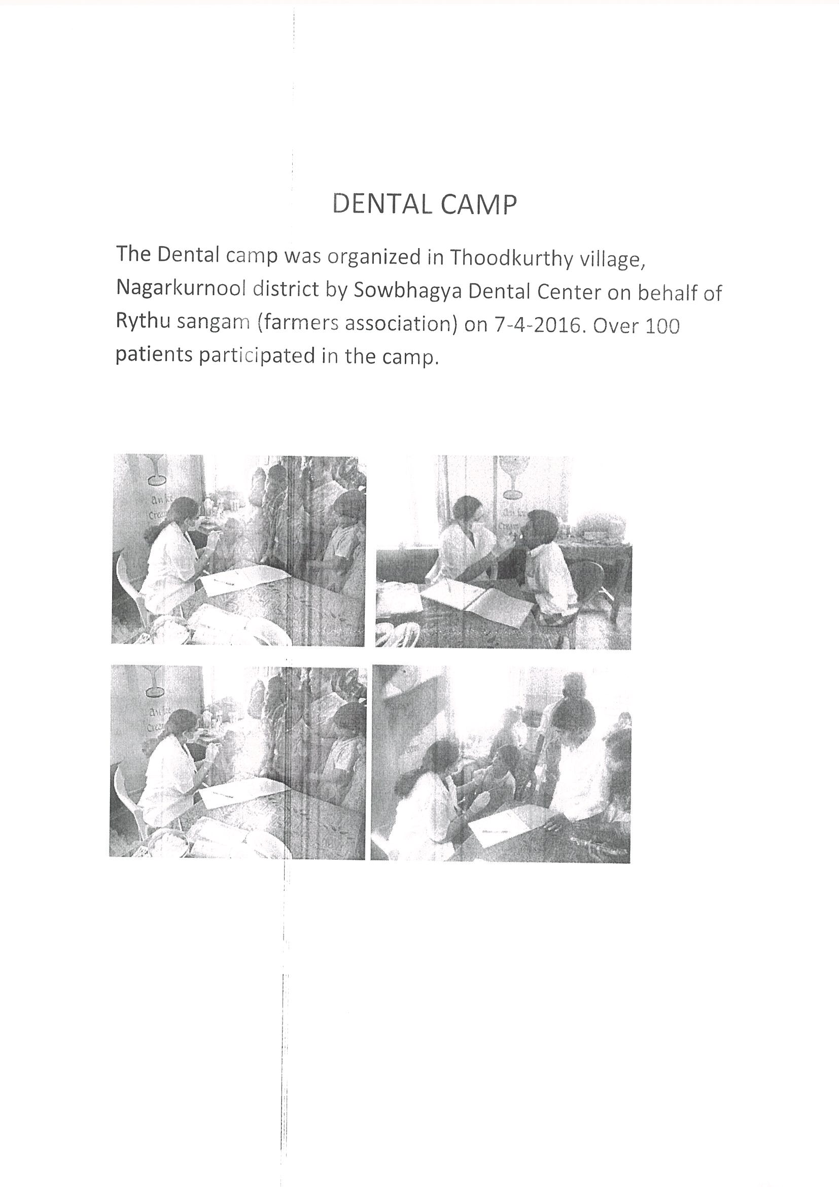 The Dental camp was organised in Thoodkurthy village, Nagaekurnool Distict by sowbhagya Dental Center on behalf of Rythu Sangam(farmers association) on 07-04-2016. Over 100 patients participated in the camp.